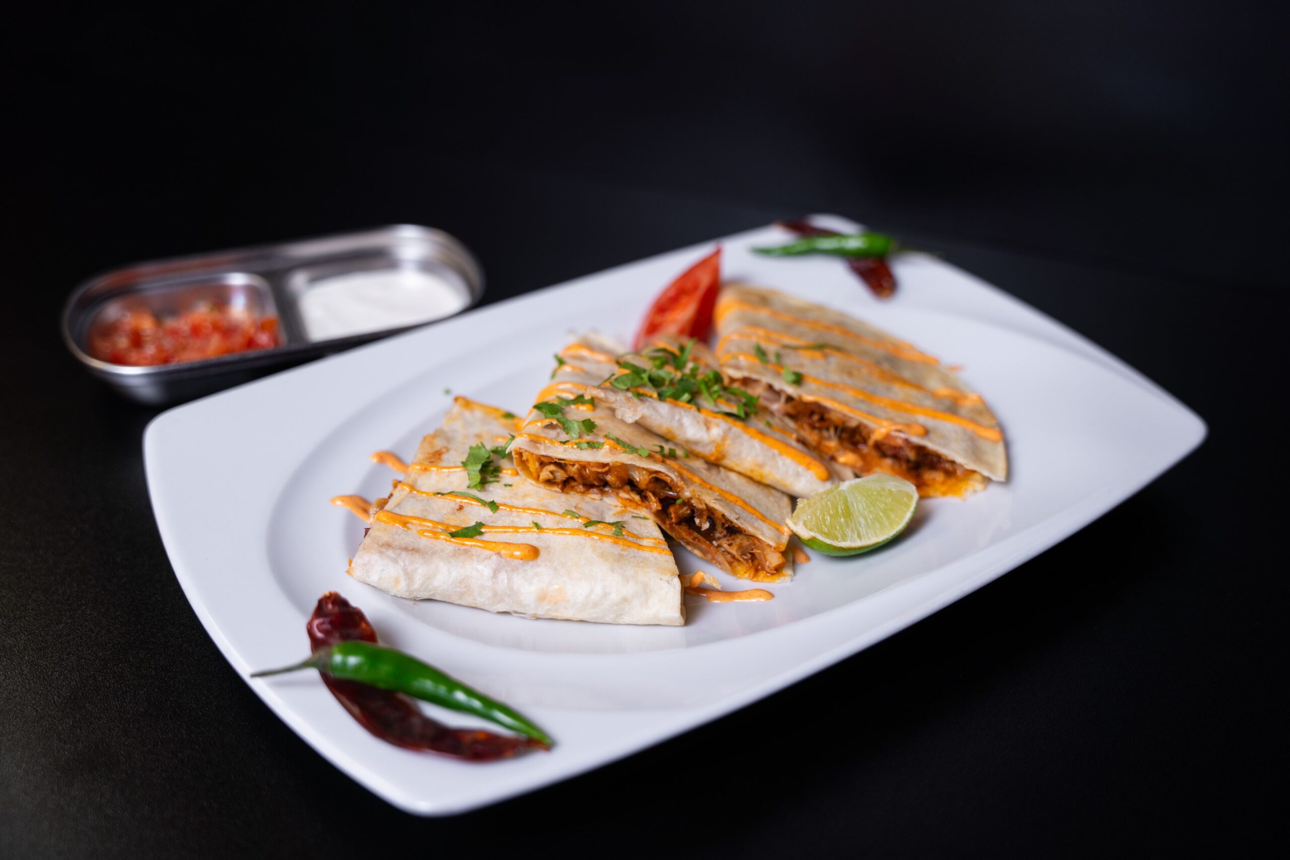 Tortillába csomagolt csirke, sajt és hagmya grillen megsütve egy kis extra salsás és tejfölös mártogatóssal