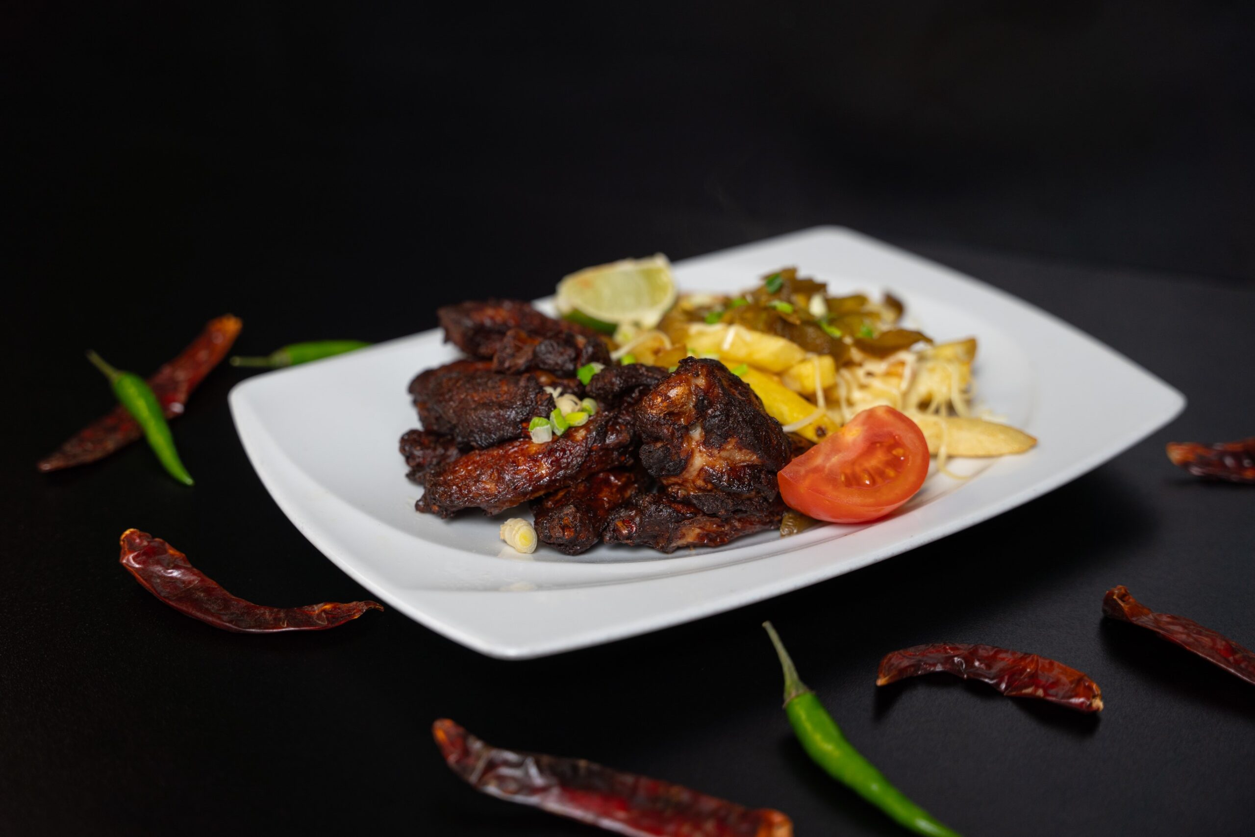 Mexikói fűszerezésű csirkeszárnyak, joghurtos mártogatóssal és sültkrumplival